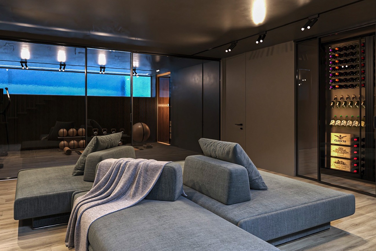 A cave é composta por uma sofisticada adega, um ginásio, duas suites adicionais, uma sauna para relaxamento e uma sala de serviço prática.